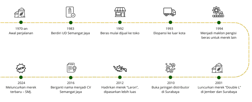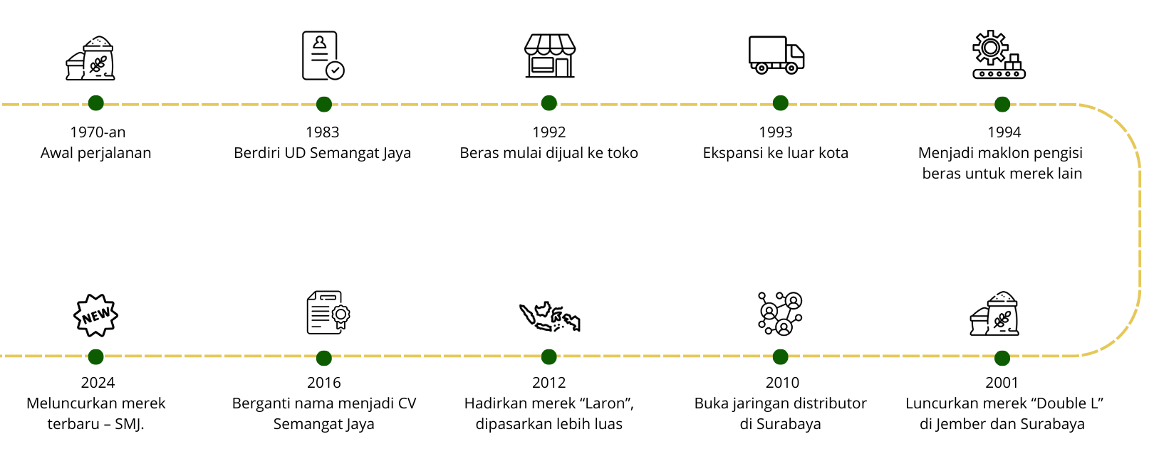 Beras Cap Laron berawal dari langkah kecil di tahun 1970-an, saat masih menyewa sawah dan mengirimkan padi ke penggilingan lain. Dengan semangat dan kerja keras, tahun 1983 berdirilah penggilingan sendiri bernama UD Semangat Jaya.